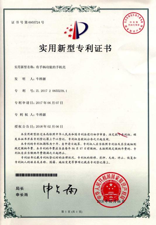 近日,从国家知识产权局获悉,304永利集团登录入口2014级机械设计制造及其自动化专业牛梓源同学设计发明的《有手柄功能的手机壳》获批国家实用新型专利证书(专利号:ZL201720655239.1)。