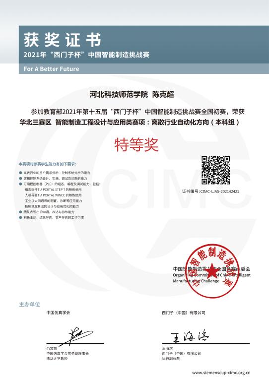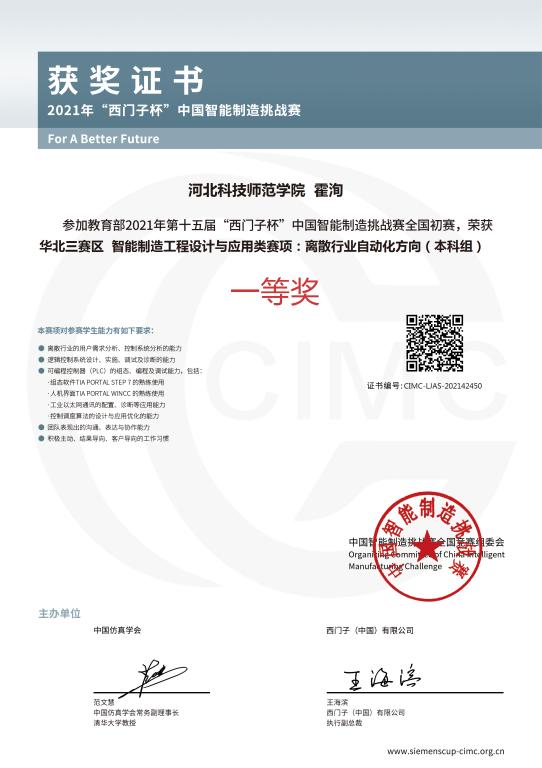 近日,2021年第十五届“西门子杯”中国智能制造挑战赛华北三赛区比赛(河北赛区)在华北理工大学成功举办。永利集团官网304永利集团登录入口9名同学组成的3支代表队参加了此次大赛,分别获得离散行业自动化方向(本科组)团体特等奖、一等奖、二等奖。