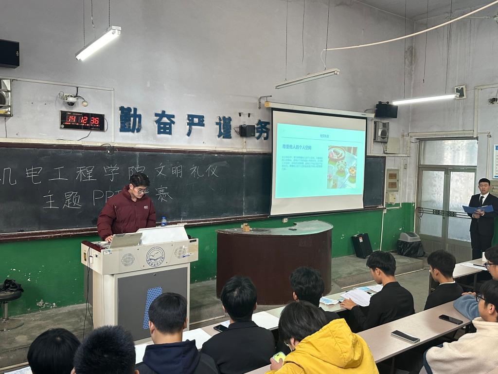 经过前期选拔,有30名同学进入复赛,比赛中参赛选手们的PPT制作精良,分别讲述了大学生课堂礼仪、宿舍文明礼仪、公共场所礼仪等日常文明行为,经过评委现场打分,魏亚亘获得第一名、杨曜玮获得第二名、路恩泽获得第三名。